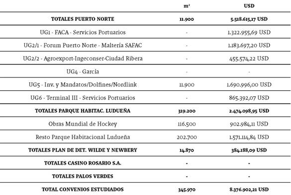 Para ello se recurrirá a los datos contenidos en la presentación elaborada por Mirta Levin (2010), quien se desempeñó como Secretaria de Planeamiento al momento de la negociación y firma de estos convenios urbanísticos. Allí se incluyen una serie de planillas-resumen con los “beneficios económicos” aportados y a aportar por los convenios urbanísticos al municipio de Rosario. Los datos se complementaron con la información relativa a Palos Verdes suministrada por la Secretaría de Planeamiento.