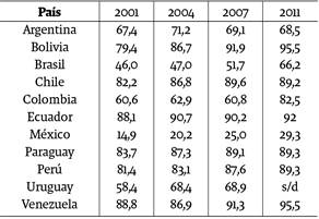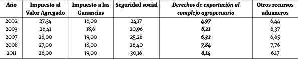 Si bien la cadena agroindustrial representa aproximadamente el 49% de la recaudación de los derechos de exportación percibidos por el Estado (Porto, 2009), es importante relativizar su importancia. Aunque los defensores del modelo sojero arguyan que la apropiación pública de parte de la renta sojera es clave para que el Estado resuelva desequilibrios comerciales, sostenga las cuentas fiscales, pague puntualmente los intereses de la deuda externa y efectúe políticas de redistribución del ingreso a través de obras de infraestructura, asistencia social y control de precios en el mercado interno, lo cierto es que los derechos impuestos a los complejos oleaginoso, cerealero y vacuno representaron en 2011 apenas el 6,17% de la recaudación fiscal nacional, no habiendo jamás superado la barrera del 8,21% (Tabla 4). Así, las retenciones como mecanismo de captación del excedente representan un magro aporte a la masa de ingresos fiscales del Estado, reducido a su vez por los intrincados mecanismos de liquidación del arancel (Palmisano, 2014).