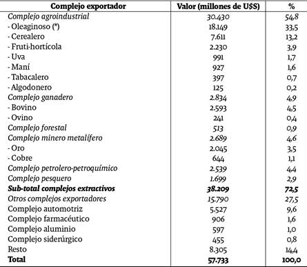 Como resultado, el agronegocio se ha configurado en el principal motor de la inserción de la economía argentina en el mercado mundial. Impulsadas por la fiebre sojera, las oleaginosas y sus derivados actualmente constituyen el primer complejo exportador del país, acaparando el 33,5% de las exportaciones nacionales. Otrora principal rubro exportable del país, los cereales fueron desplazados al segundo lugar (13,2% del total), en tanto que la ganadería bovina, relegada a áreas marginales y reconvertida a sistemas intensivos o feed-lots, redujo su incidencia general al 4,5% (MH-INDEC, 2017).