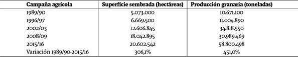 El nuevo patrón de acumulación del sector rural en el país se desarrolló a expensas de la ganadería (masiva liquidación de vientres, retracción del área pecuaria, reducción del hato ganadero y el número de tambos) y los cultivos tradicionales pampeanos (avena, cebada, alpiste, mijo, lino, trigo, girasol) y extrapampeanos (caña de azúcar, algodón), cuya superficie retrocedió significativamente. En contraste, la frontera agrícola se expandió aceleradamente en el caso de las producciones extensivas de arroz, maíz3 y, sobre todo, soja. Según cifras oficiales (Minagri, 2016), entre 1989/1990 y 2015/2016, la superficie sojera pasó de 5.073.000 a 20.602.542 hectáreas y su producción granaria trepó de 10.671.100 a 58.800.498 t, de lo cual se desprende que ambas aumentaron 306,1% y 451%, respectivamente (Tabla 3).
