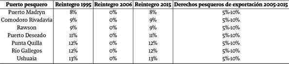 No existió, tampoco, intervención directa por parte del Estado en el sector. Con gran peso relativo (76%) de la merluza común, el calamar y el langostino (DEP, 2016b), en 2015 las exportaciones pesqueras representaron el 95% de la extracción global9 (DEP, 2016a), dando cuenta del 2,9% del comercio exterior nacional (MH-INDEC, 2017). Sin embargo, el Estado no se apropió de una parte sustancial de la renta: de hecho, los derechos de exportación impuestos al sector fueron del 10% para el pescado congelado a bordo y del 5% para el pescado fresco procesado en tierra. Asimismo, los reintegros a las exportaciones por puertos patagónicos vigentes durante la fase neoliberal, que en 2006 habían sido eliminados, fueron restablecidos en 2015 en sus valores originales, con montos que oscilaban entre el 8% y el 13% del valor comercializado, licuando y/o directamente eliminando (según el caso) los magros ingresos estatales en concepto de retenciones (Tabla 5).