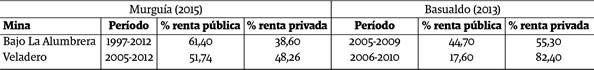 Realizada por Basualdo (2013) , la otra estimación presentada en la Tabla 6 es más realista, en un contexto donde la participación del Estado en la renta minera es del 44,70% en el caso de Bajo La Alumbrera y de apenas el 17,60% en el de Veladero. Nótese que este último caso, que pertenece a la segunda generación de proyectos mineros -esto es, la iniciada durante el neodesarrollismo-, muestra una participación estatal en la renta minera mucho menor que la exhibida en el caso de la mina que comenzó a operar durante el neoliberalismo, mostrando así el impacto diferencial de los beneficios adicionales otorgados por el “progresismo” al sector. Aún así, debe señalarse que esta estimación tampoco incluye las inversiones y demás erogaciones del sector público.