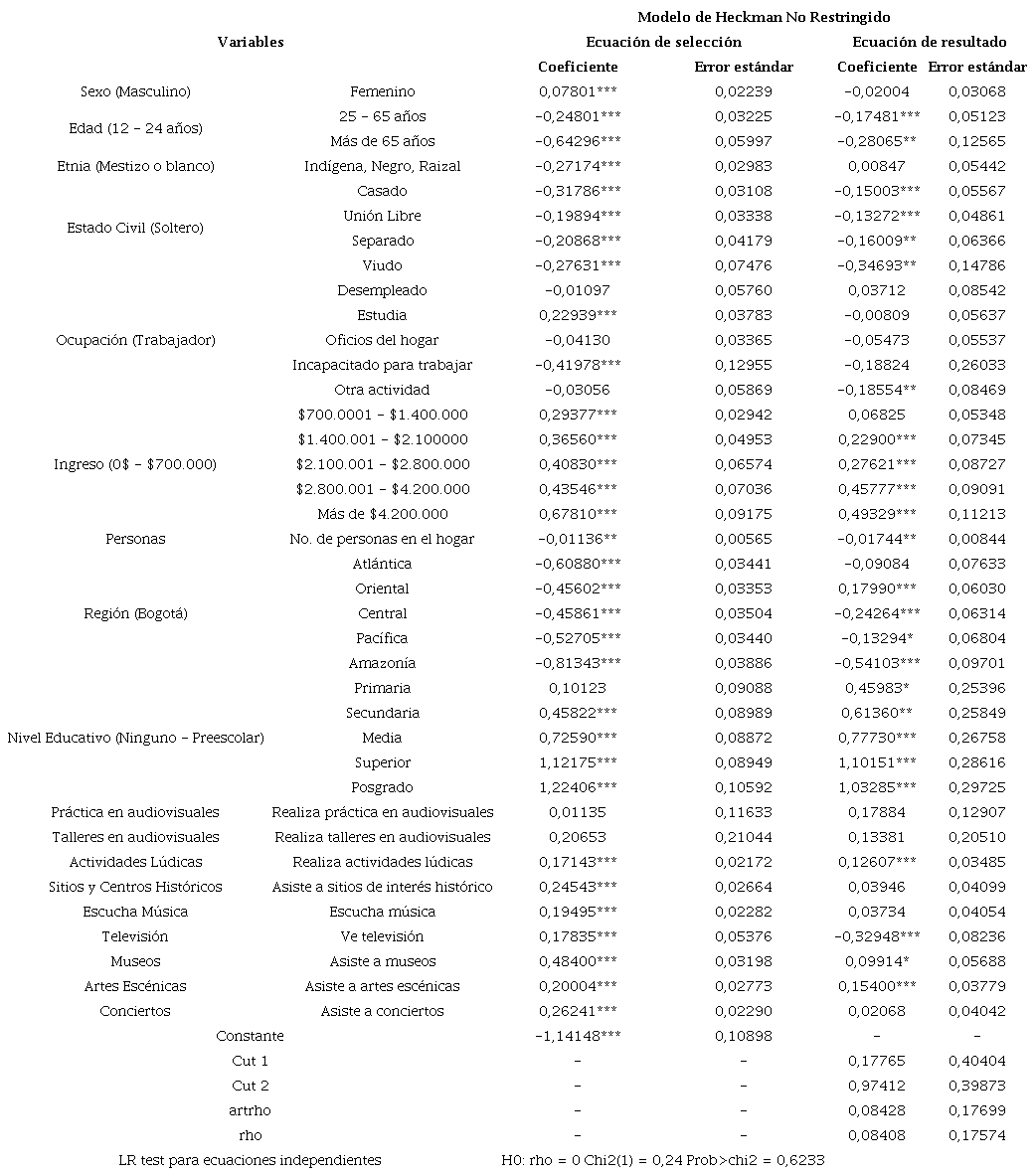 La evidencia indica que, al aplicar la restricción de exclusión, no existe sesgo de selección en la asistencia a cine en Colombia. Lo anterior debido a que el coeficiente de correlación de los términos de error de las dos ecuaciones (rho) no es significativo y a que no se rechaza la prueba de Razón de Verosimilitud realizada para verificar la hipótesis nula de independencia entre las ecuaciones. Por tanto, cada ecuación se estima de manera independiente a través de un modelo probit y un modelo probit ordenado respectivamente. En este trabajo se interpretan los resultados de los últimos modelos que también se reportan en la Tabla 2. El lector puede verificar que las estimaciones no difieren en gran medida de las obtenidas en el modelo HNR en lo referente a magnitud, efectos marginales y significancia.