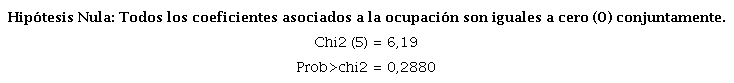 Las percepciones preliminares derivadas del análisis descriptivo bivariado se verifican formalmente con la estimación de los modelos econométricos. En la Tabla A-2 del Anexo se reportan los resultados del modelo HNR. Con base en la evidencia del modelo se determina que la restricción de exclusión a aplicar en este trabajo consiste en omitir la Ocupación de la ecuación de resultado. Para justificar estadísticamente la restricción se aplica una prueba de significancia conjunta sobre todas las categorías asociadas a tal variable en la ecuación de resultado. Los resultados de la prueba que se presentan en la Tabla A-3 indican, con un nivel de significancia del 1%, que omitir la variable es una restricción de exclusión válida. Los resultados del modelo HR se presentan en la Tabla 2.