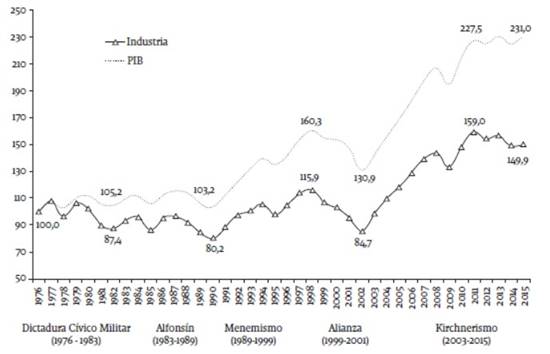 Se trató, de todos modos, de un fenómeno que reconoció distintas etapas. Desde el golpe de Estado de 1976 y hasta el fin de la administración de Alfonsín, en 1989, tuvo lugar una profunda contracción del valor agregado industrial en un contexto de estancamiento económico. Esta fase no solo incluyó la destrucción neta del stock manufacturero, sino también la disolución de una parte importante del entramado de eslabonamientos y articulaciones intra e interindustriales. Dicho proceso implicó la pérdida tanto de las capacidades como de la densidad tecnológica que se había alcanzado durante la etapa de industrialización sustitutiva.