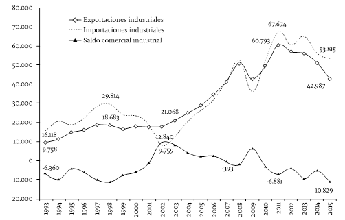 Al respecto, cabe señalar que el ritmo de crecimiento de las importaciones de productos industriales fue mucho más acelerado que el de las exportaciones de este mismo rubro. Así se generó un elevado deterioro de la balanza comercial industrial, que pasó de un superávit de 9.759 millones de dólares, en 2002, a un déficit de 6.881 millones, en 2011, para luego acrecentarse a 10.829 millones, en 2015, a pesar de los controles a las compras del exterior (Figura 3).