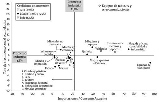 En todos ellos, se advierte una abultada demanda de importaciones a raíz de la marcada desintegración vertical de sus actividades. Por ejemplo, en equipos de radio, televisión y comunicaciones el coeficiente de integración fue de apenas el 15,7%, en tanto que en la industria automotriz fue de 18,3% (datos correspondientes al promedio del período 2003-2015). En efecto, se trata de cuasi enclaves importadores, cuyos coeficientes de integración vertical son marcadamente inferiores al magro nivel de la industria en su conjunto (31,5%).