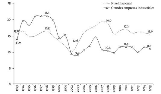Así, en los datos aportados por la Figura 5 se advierte que la tasa de inversión de las grandes empresas industriales fue de tan solo el 11,1%, sobre el valor agregado, entre 2003 y 2015. Se trata de un nivel que fue apenas superior a los requerimientos resultantes de las depreciaciones del capital que insume el proceso productivo, fue inferior al registrado durante los años noventa y fue sistemáticamente menor a la tasa de inversión nacional.