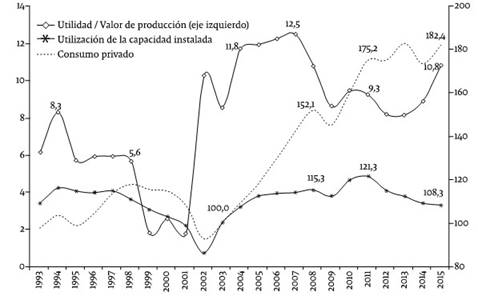 Resulta interesante advertir, por un lado, que -ante la emergencia de la restricción externa y la acentuación de diversos desequilibrios macroeconómicos- el desempeño de la inversión de las grandes industrias de la economía argentina se mantuvo inmutable; siempre en un bajo nivel. Por el otro, que en la generalidad de los casos se trató de un contexto operativo signado por una elevada rentabilidad en términos históricos, un fuerte impulso al consumo en prácticamente todo el período y una tendencia a una mayor utilización de capacidades ociosas después de la crisis de 1998-2002 (Figura 6). Es decir, un escenario en el que los factores locales que tienden a alentar las decisiones de inversión en el ámbito productivo resultaron favorables9. De allí que se trate de un fenómeno que puede ser caracterizado como de baja propensión inversora por parte de las grandes compañías fabriles (Manzanelli, 2016).