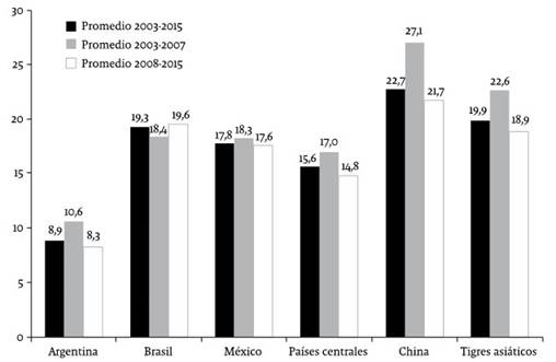 En este sentido, resulta interesante observar el comportamiento inversor de las transnacionales en el exterior, de modo tal que se distinga si el reducido nivel de inversión observado para el caso argentino se corresponde (o no) con un comportamiento similar en otros países. Esto puede realizarse mediante los datos aportados por la Survey of Current Bussines, que capta la tasa de inversión bruta sobre el valor agregado de las filiales industriales de los Estados Unidos, según un conjunto de zonas económicas de relevancia: Argentina, Brasil y México -en el caso de América Latina-, China, los tigres asiáticos y los países centrales. Se trata de un conjunto de países representativo del comportamiento de las filiales norteamericanas, ya que explican alrededor del 70% del valor agregado de las filiales de los Estados Unidos en el período 2002-2015.