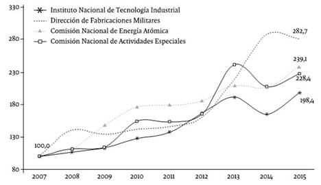 En este sentido, un primer caso a señalar es el creciente peso que asumieron las políticas orientadas a la generación de capacidades tecnológicas (software, biotecnología y nanotecnología) y a la infraestructura de ciencia y tecnología, no solo a través de los recursos destinados a tales fines desde el Ministerio de Ciencia y Tecnología, sino de organismos descentralizados como el Instituto Nacional de Tecnología Agropecuaria (INTA), el Instituto Nacional de Tecnología Industrial (INTI), la Comisión Nacional de Actividades Espaciales (CONAE), la Comisión Nacional de Energía Atómica (CNEA) y la Dirección de Fabricaciones Militares, cuyos presupuestos fueron más que duplicados en esta etapa (Figura 8).