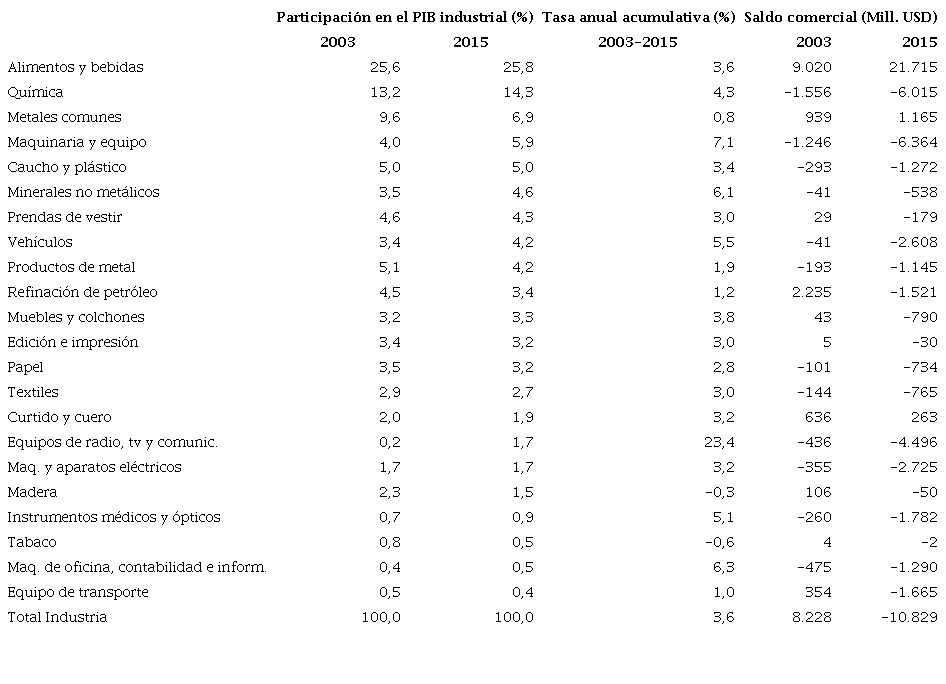 Las evidencias que constan en la Tabla 1 muestran que, en 2003, el 68,8% de la estructura fabril, medida a través del peso en el valor agregado industrial, estaba compuesta por ocho sectores: alimentos y bebidas, sustancias y productos químicos, metales comunes, maquinaria y equipo, caucho y plástico, minerales no metálicos, prendas de vestir y vehículos automotores. Tras el acelerado crecimiento y la contracción industrial, a partir de 2011 no se advierten modificaciones significativas en la importancia relativa de estos sectores: más bien, su peso relativo se incrementó al 71,1%, en 2015.
