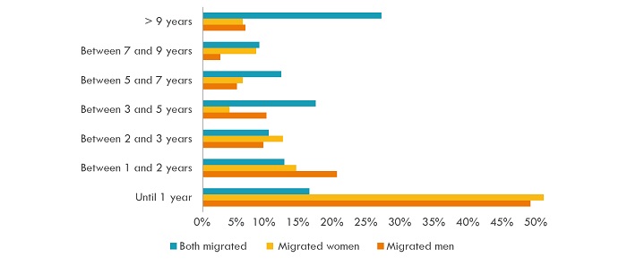Figure 1 shows the years of migratory experience of the Latin American couples sample. When only one member of the couple migrated, approximately half returned one year later. However, if both migrated, 84.3% of the couples last in the destination country for more than a year. Even more, 26.3% of these couples last more than nine years outside their country.