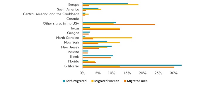 Figure 2 shows the places where the sample of the Latin American migrated. The majority of them migrated to the United States and Europe. When men migrated alone, about 30% of them went to California. Women who migrated alone went mainly to Europe (18%), North Carolina (16%), California (12%), and New York (12%). The main destinations where couples migrated together were California (32%) and Europe (14.5%).