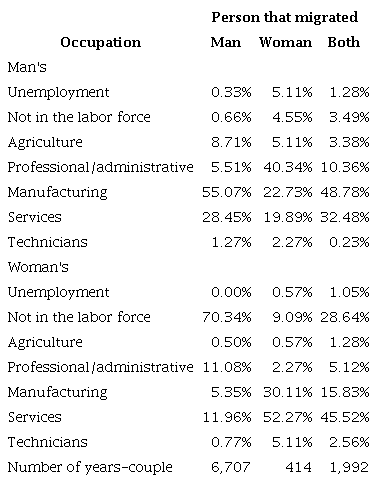 The men of the couples with one migrant tended to work more on blue-collar activities than non-migrant males in the respective Latin American labor market. The men of couples where both migrated participated less in the labor market than the other men (4.3% vs. 2%) and concentrated more on white-collar activities.
