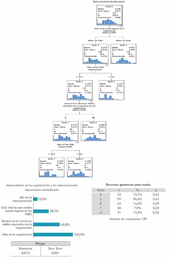 Para comprender mejor los resultados del árbol de regresión es importante analizar tres cuadros adicionales que facilitan la interpretación del árbol, que se adjuntan con el gráfico del árbol. El primer cuadro es el riesgo del modelo a partir del error de estimación que tiene. Un error de estimación de 0,01 se considera adecuado para la interpretación. El segundo cuadro, llamado Importancia normalizada, compara, en términos relativos, la capacidad predictora de las variables incluidas, tomando la más importante del modelo como el 100% para determinar la capacidad explicativa de los cambios de la variable dependiente. El cuadro del resumen de ganancias muestra la distribución de los grupos de clasificación en nodos terminales, donde ya no presenta ninguna variabilidad. Así se presenta el número de casos en cada nodo terminal y su porcentaje. Finalmente, el árbol muestra la forma en que las variables regresoras o independientes presentan una mayor significancia y variabilidad para mostrar una especie de construcción de tipos. En cada nodo se presenta la media y desviación típica correspondiente al índice multidimensional de desafiliación, el tamaño del nodo y el valor pronosticado. Como la variable independiente es de escala, se presenta la distribución del grupo con un pequeño histograma.