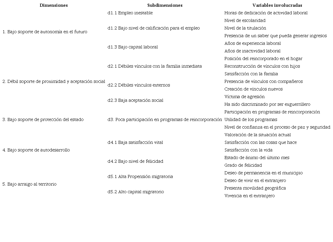 La 3ª dimensión de “soporte de protección del Estado” analiza al ciudadano depositario de derechos bajo la forma de la protección social que brinda el Estado. En el caso de los reincorporados se vincula con la participación en los programas de reincorporación. Está conformado por tres variables. La 4ª dimensión, “soporte de autodesarrollo”, hace referencia a la capacidad de agencia del sujeto para autoconstruirse y modificar las condiciones de su propia realidad. Tiene dos subdimensiones: “baja satisfacción vital” y “bajo nivel de felicidad”. Está conformado por cinco variables en total. La última dimensión, “arraigo al territorio”, aborda la adhesión al territorio. Consta de dos subdimensiones: “propensión migratoria” y “capital migratorio” como elementos claves que hacen proclive a un sujeto a migrar y le dificultan echar raíces. Tiene 4 variables.