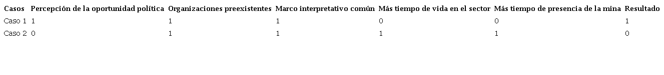 Con estas cinco condiciones, construí una tabla comparativa basada en la propuesta metodológica de Ragin (1987) sobre el uso de la lógica booleana para el análisis cualitativo comparado. En la Tabla 1, 0 representa una condición que no se presentó y 1 una que sí se presentó en cada caso, y la casilla de resultados tiene un 1 para el caso en el que hubo movilización y un 0 para el caso en el que no se ha presentado movilización. La Tabla 1 me permitió identificar condiciones necesarias, pero no suficientes para la movilización.