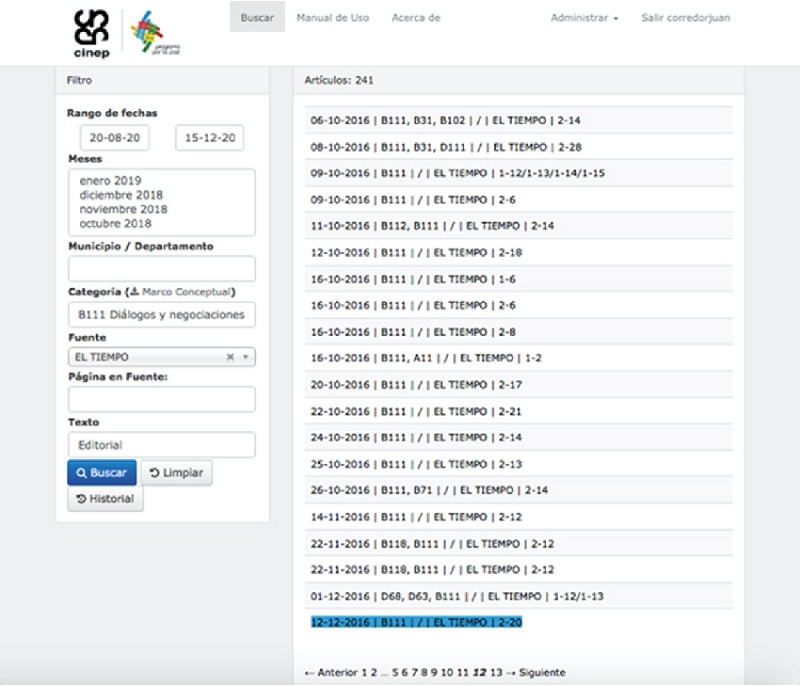 Por medio del Archivo Digital de Prensa del Centro de Investigación y Educación Popular (CINEP, 2019), se recolectaron los editoriales de la categoría B111, “conflicto armado y las negociaciones de paz”, que arrojó todas las referencias de noticias de paz. Se utilizaron las siguientes palabras clave para filtrar las noticias: editorial, paz, negociación, diálogos, acuerdos, FARC. Tras la depuración de los datos, se constituyó un corpus de 568 editoriales2. En la Figura 1 y Figura 2 se evidencia el proceso de recolección de los editoriales y la muestra del corpus en el Archivo Digital de Prensa.