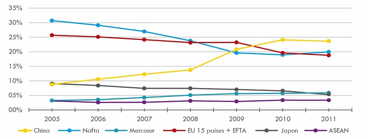 El Nafta y EU muestran una importante tendencia decreciente (del -10,8% y -6,9%, respectivamente). Los mayores aumentos se ven en China (14,9%), MERCOSUR (2,6%) y ASEAN (0,2%), y en las mismas no se observa una baja de sus ventas en los años de crisis mundial 2008-2009.