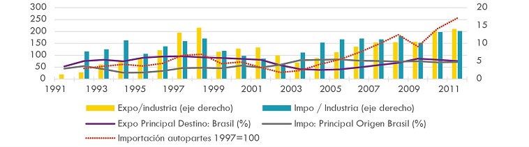Brasil se convirtió en el principal destino exportador, con un 91,7% de las totales para ese año. Desde Brasil, la participación de las exportaciones hacia Argentina entre 1993 y 1998 promedió el 63,6%, mientras que en 1990 era de tan solo 20,2% (ANFAVEA, 2000). La importación de autopartes creció de manera sostenida en la fase de expansión de 1991 a 1998, mostrando como uno de los rasgos más importantes del modelo regional la dependencia tecnológica.
