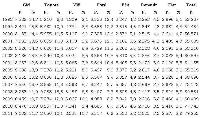 La industria automotriz entre 1998 y 2011 -Tabla 1- presenta una clara tendencia de crecimiento, liderada por GM, Toyota y VW, y en la cual Ford y Fiat son las únicas que tienden a la baja.