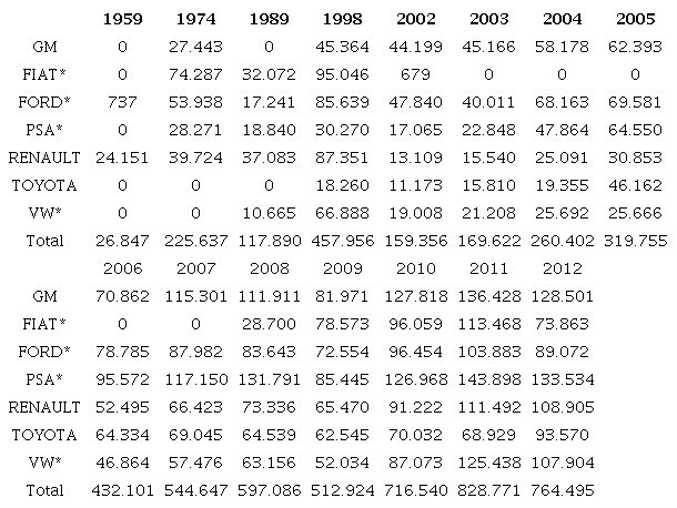 Renault y PSA continuaron con estrategias MS por su desarrollo incipiente en Brasil (ANFAVEA, 2012).