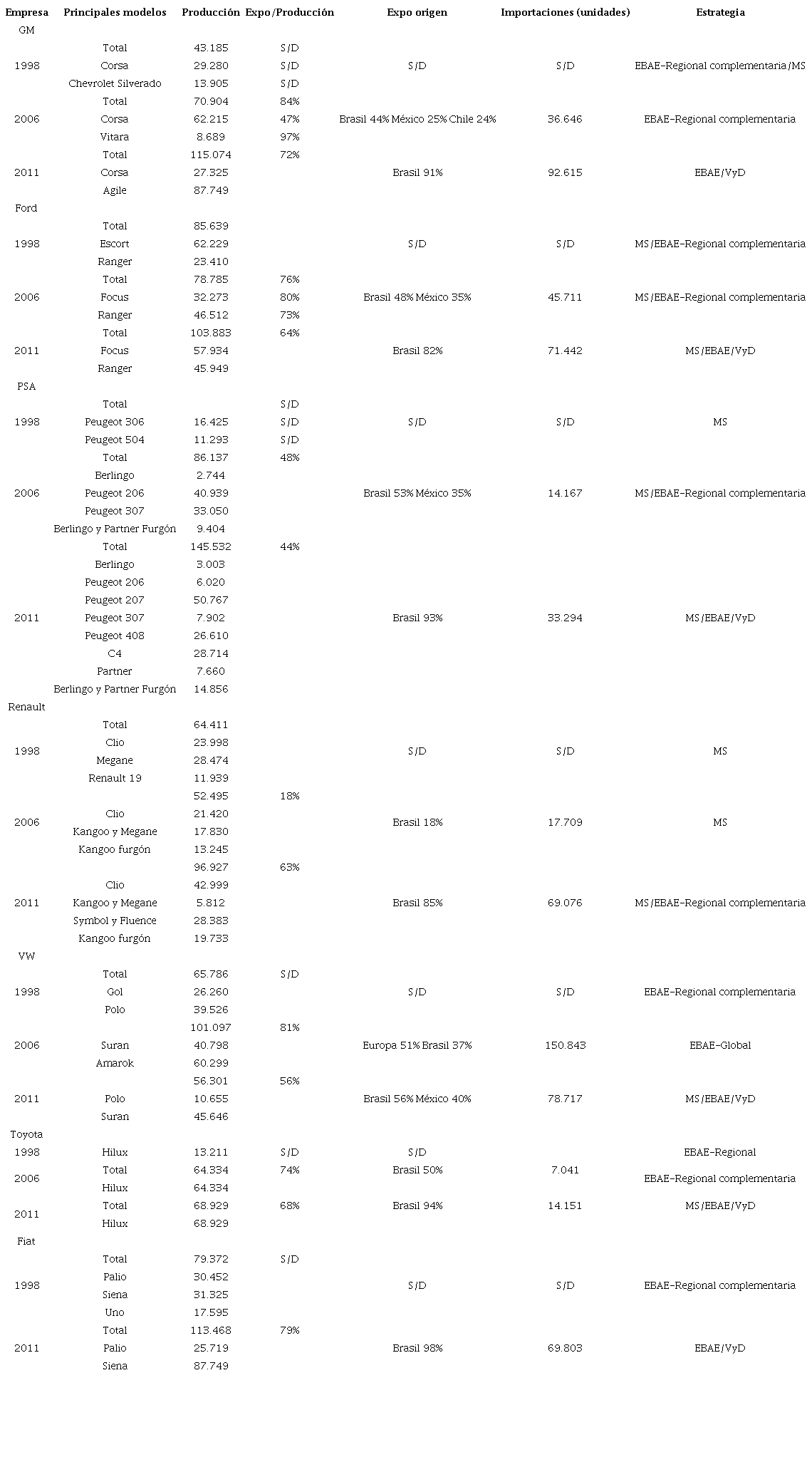 En particular, se ha expuesto que GM realiza estas estrategias con modelos tales como el Corsa y Agile. Por su parte, Fiat vuelve a producir en Argentina, pero orientando su producción principalmente a las exportaciones e importaciones y estableció los modelos Palio y Siena. Ford incrementó su fabricación de los modelos Focus y Ranger, cuestión que le permitió aumentar el flujo de importaciones. Mientras que PSA y Renault, a diferencia del resto de las empresas, tuvieron poca participación en las diferentes regiones del mundo, realizando una fuerte apuesta en el MERCOSUR. Para esto incorporaron modelos nuevos y cambiaron su estrategia predominantemente MS para incluir las EBAE. VW fue la automotriz que más exportó hacia Europa, aunque depende del mercado regional por la importación del Gol. Por último, Toyota mantuvo la producción de su único modelo, Hilux, pero profundizó el comercio hacia Brasil.