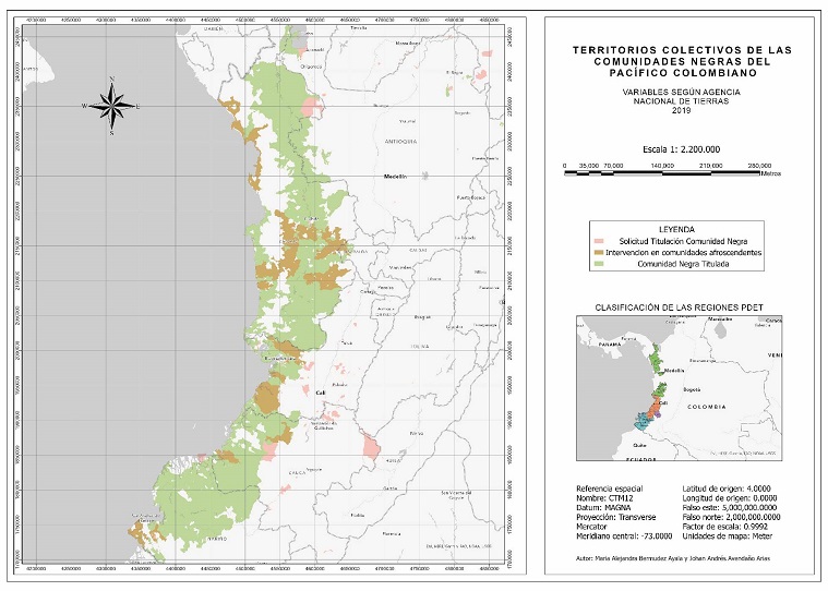 En la actualidad, gracias a la implementación del Acuerdo de Paz de La Habana -firmado entre el Gobierno de Colombia y las extintas guerrillas de las Fuerzas Armadas Revolucionarias - Ejército del Pueblo (FARC-EP)-, se logró focalizar a las comunidades más golpeadas por el conflicto armado, con el interés de abrir líneas de justicia y reparación (JEP, 2016). De allí sale la figura de los Planes de Desarrollo con Enfoque Territorial (PDET), como un instrumento dentro del marco de la planificación y gestión del suelo a un intento por contrarrestar las repercusiones de la violencia en territorios como los de comunidades negras. Caracterizados además con altos índices de pobreza, presencia de cultivos de uso ilícito, control territorial de grupos armados ilegales y debilidad institucional (Celemín y Mejía, 2019).