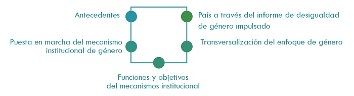 En la primera parte del esquema de trabajo se realizó una búsqueda temática sobre los mecanismos institucionales de género en Colombia. Esta se estructuró en el hallazgo de antecedentes, desarrollo y transversalización del enfoque de género; y las funciones y objetivos del mecanismo. A continuación, se presenta la Figura 1, que describe el esquema de revisión para los países seleccionados a través de lineamientos internacionales.