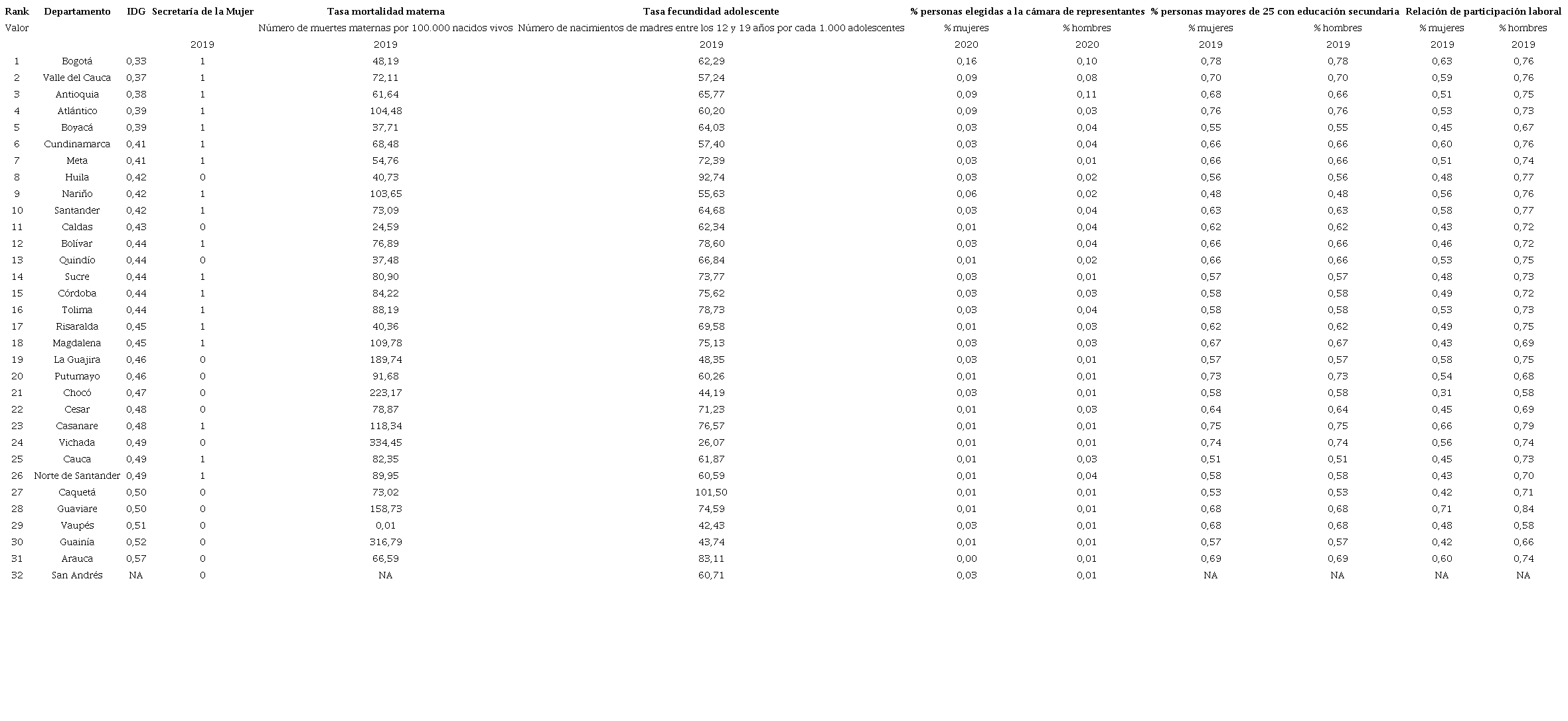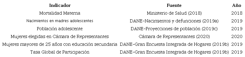 Las variables referenciadas anteriormente se refieren a la información disponible al 23 de mayo de 2021. Para ese momento, los datos de mortalidad materna presentados por el Ministerio de Salud estaban disponibles hasta el 2018. Para los nacimientos de madres adolescentes, población adolescente, mujeres mayores de 25 años con educación secundaria y Tasa Global de Participación, los datos disponibles en las bases de datos del DANE (2019a) estaban hasta el 2019; frente a los datos de participación política de las mujeres, se utilizó la base de datos disponible en la Cámara de Representantes (2020)para el año 2020.