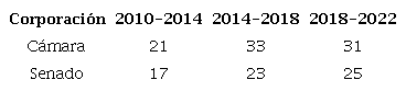 En lo relativo a la participación política de las mujeres, al analizar las ocho elecciones al congreso que se han realizado desde el año 1991, se puede señalar que existe un aumento considerable en dicha participación, eso teniendo en cuenta la puesta en marcha de la ley 1475 de 2011. En esta se exige el 30% de la participación de las mujeres en las diferentes listas a las corporaciones. Es así como, según el informe que presentó Colombia ante la Plataforma de acción de Beijing + 25, para 1991 el promedio de elección de mujeres en Senado y Cámara era de 7,7%, mientras que para la última elección (2018), la participación fue de 20.8%. Es importante manifestar que, para 2021, la meta que se estableció en el plan de desarrollo “Pacto por Colombia- Pacto por la Equidad” 2018-2022 es de 30% (ver Tabla 2).