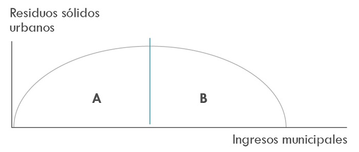 Por otra parte, en la Figura 1 puede observarse la curva de Kuznets en forma de U inversa, empleando variables de residuos sólidos urbanos versus ingresos municipales. La hipótesis sustenta que en una primera etapa “A”, el aumento de los ingresos y del crecimiento económico genera mayor contaminación, dada la explotación de recursos naturales, hasta llegar a un punto máximo donde comenzará el “desacoplamiento del crecimiento económico de la contaminación ambiental”. En la segunda etapa “B”, el crecimiento económico continuará incrementándose, sin embargo, la emisión de residuos sólidos urbanos y el impacto por la contaminación de los mismos descenderá. Esto debido a que dicho crecimiento económico demandará mayor calidad ambiental, ya que los agentes económicos al tener mayores ingresos incrementan su demanda por un ambiente limpio.