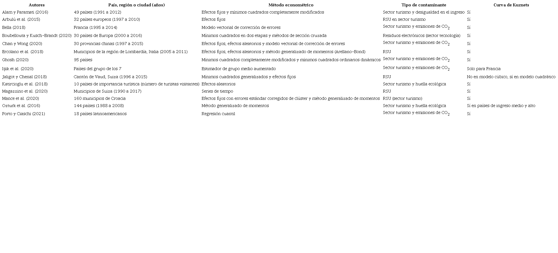 Una breve recopilación de estudios de desacoplamiento y curva ambiental de Kuznets en la generación de RSU y en el sector turismo, se muestra en la Tabla 1.