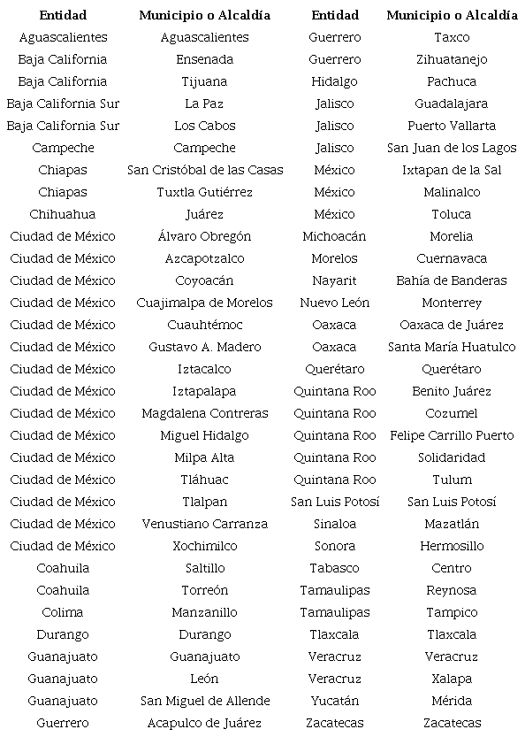 Sobre los municipios que comprende esta investigación, se señala que los 186 considerados incluyen destinos variados como playas (Acapulco, Bahía de Banderas, otros), destinos de ciudad (la mayoría de las alcaldías de Ciudad de México, Guadalajara, otros) y los denominados pueblos mágicos. También es importante señalar que algunos de los destinos turísticos rebasan el límite municipal, como es el caso de la Ciudad de México, la cual fue considerada por alcaldías4.