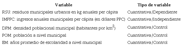 Como en las investigaciones de CAK mencionadas en la Tabla 1, en este trabajo los RSU se estimaron para cada año y posteriormente se dividieron por la población municipal. De tal forma, en esta investigación se empleó como variable dependiente los RSU municipales en kilogramos anuales per cápita para los años 2010 y 2015 (INEGI, 2010; 2015). Lo anterior permite relacionar incrementos o decrementos en la generación de RSU en términos per cápita con cambios en términos per cápita del ingreso.