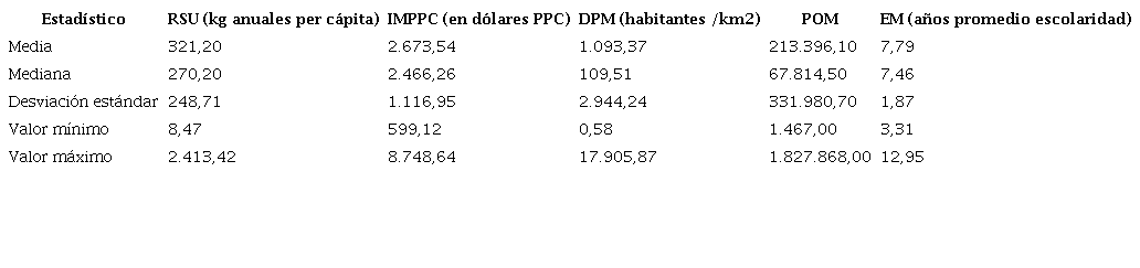 El análisis de estadística descriptiva (Tabla 5), muestra que la media para RSU es de 321,20 kilogramos anuales per cápita, con una desviación estándar de 248,71. Por su parte, la variable IMPPC tuvo una media de 2.673,54 dólares anuales per cápita, presentado un valor máximo de 8.748,64 y un mínimo de 599,12 dólares anuales per cápita. Mientras en el caso de la densidad (DPM) la media fue de 1.093,37 habitantes por kilómetro cuadrado, con una desviación estándar de 2.944,24. Con respecto a población (POM), su media fue de 213.396,10 y la escolaridad tuvo una media de 7,79. A destacar que las medianas de todas las variables tienden a ser inferiores a sus medias estimadas (ver Tabla 5).