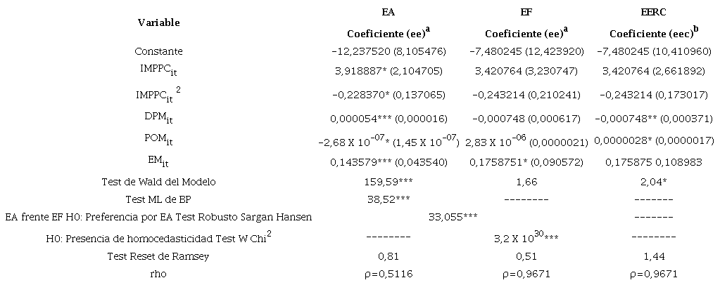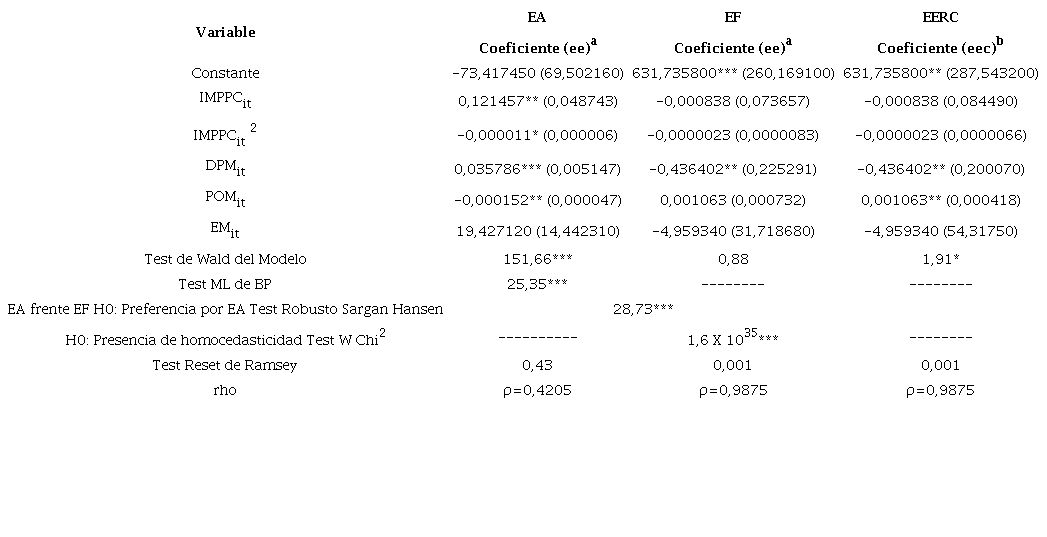 Para seleccionar entre los resultados de EF y EA, se aplicó al modelo de EA un test robusto ante heterocedasticidad dentro de los paneles, basado en el estadístico de Sargan-Hansen, de acuerdo a lo recomendado por Arellano (1993) y Wooldridge (2010), bajo la hipótesis nula que favorece la elección de EA. Los resultados, como se verá posteriormente favorecieron los resultados de EF.