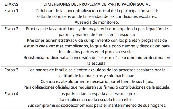 En este artículo hemos descrito cuatro etapas del análisis del problema encontrado en nuestra investigación participativa y que corresponden a los cuatro niveles de complejidad de la posible participación de los padres en la educación escolarizada de sus hijos, tratando de volverla un proceso más interactivo. En la primera, comentamos el bien intencionado deseo de los funcionarios de invitar a todos los ciudadanos interesados en la educación de sus hijos a colaborar con los maestros en sus escuelas, como ya lo señaló el Acuerdo Nacional para la Modernización de la Educación Básica de 1992. Sin embargo, la ausencia de medidas para supervisar, corregir e institucionalizar los instrumentos de los CEPS para convertirlos en un verdadero diálogo entre maestros y padres, los hizo un intento fallido más en el camposanto de experimentos progresistas de educación. La segunda etapa nos muestra cómo las buenas intenciones son insuficientes para contrarrestar las fuerzas contradictorias que acechan a todos los niveles del sistema educativo, en especial la escuela. En este espacio, los maestros, bajo crecientes presiones de rendir cuentas a sus superiores, resistieron lo que les pareció una potencial intrusión en su dominio escolar y reforzaron su autoridad tradicional como trabajadores del Estado para difuminar la participación de las madres y los padres en la escuela.