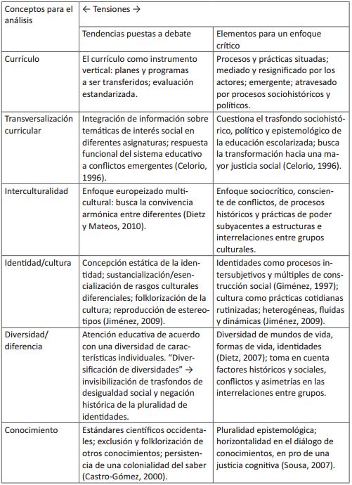 Celorio (1996) aduce que los temas transversales del currículo representan demandas sociales que se integran a la educación para su “consumo menos conflictivo” (p. 64); la inclusión de un eje intercultural funcional, pero no crítico (Walsh, 2000), al currículo, podría reflexionarse en este sentido. Paraskeva señala que es necesario una aproximación a la multiculturalidad “that adopts an emancipatory content and direction aimed mainly at the multiple articulations of difference” (Paraskeva, 2011, p. 154). La articulación de la diferencia, por ende, no ha de reducirse a la enunciación de la multiplicidad de culturas; desde el planteamiento crítico, la demanda de una justicia educativa exige el cuestionamiento de los trasfondos de los contenidos escolares, de su evaluación y de las estructuras que determinan el quehacer cotidiano de los actores educativos.
