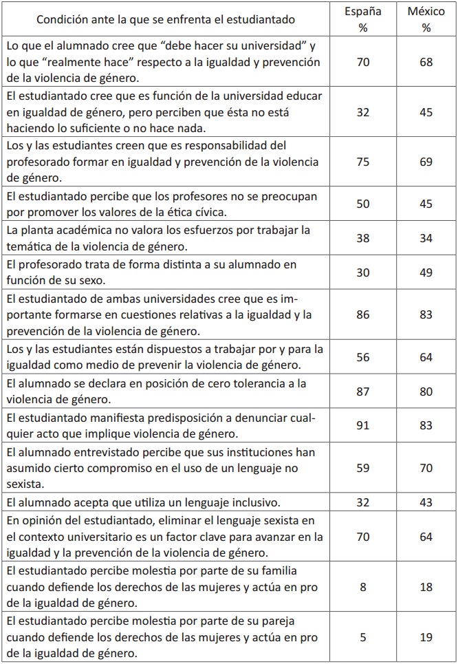 En síntesis, en las universidades siguen existiendo elementos que generan desigualdades, discriminación, injusticia e incluso VG. Al realizar el estudio comparado, hallamos diferencias entre universidades de dos países; habría sido descabellado pensar que las respuestas dadas por el alumnado de una universidad y otra fueran idénticas, ya que son contextos distintos; cada uno con su singularidad, idiosincrasia y complejidad. No obstante, de forma global, los resultados han revelado tendencias similares en las percepciones del estudiantado respecto a las cuestiones investigadas.