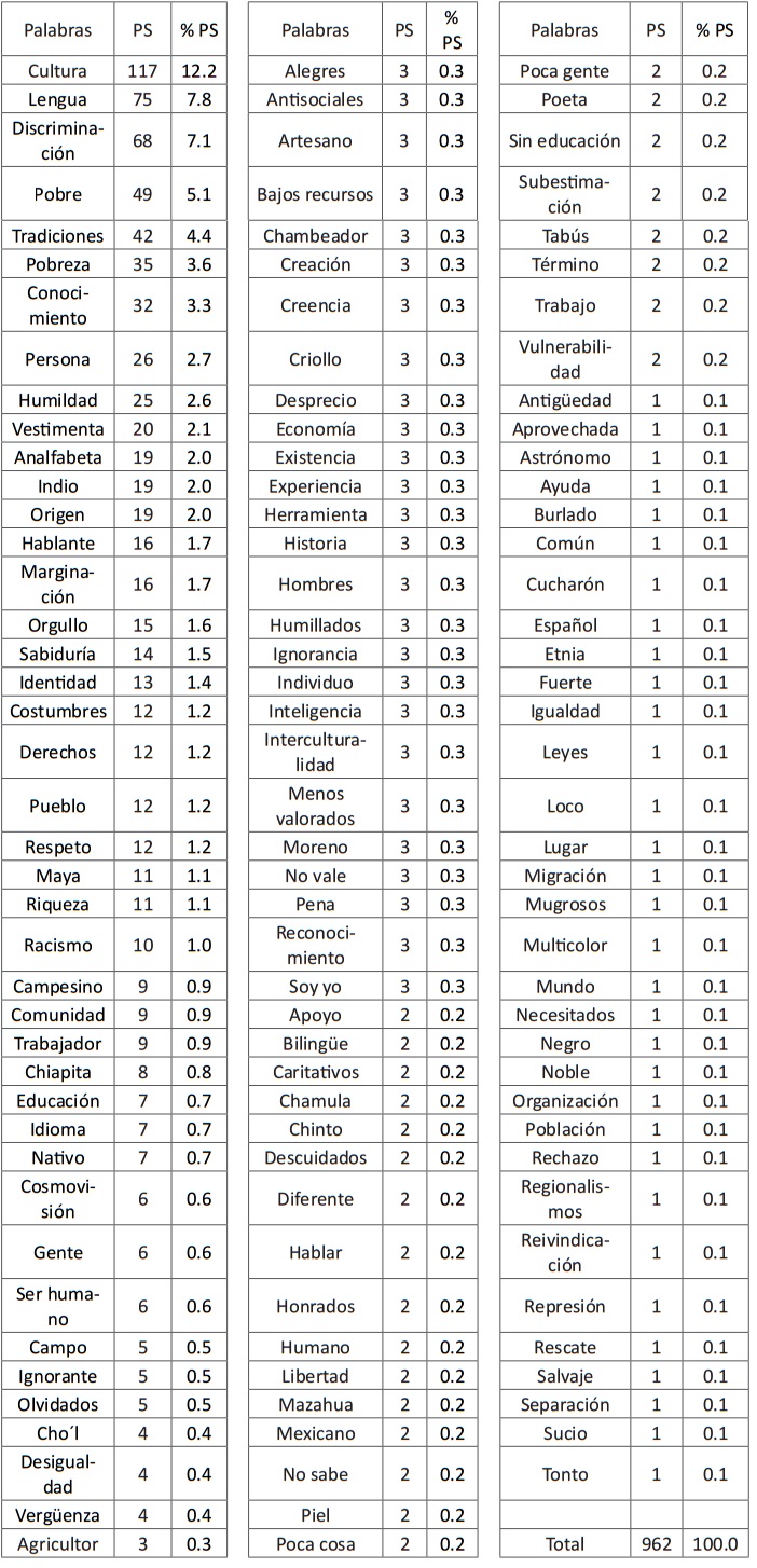 En la tabla 3 resaltan términos favorables hacia el indígena, con alto peso semántico: cultura (117), lengua (75), tradiciones (42), conocimiento (32). Estos vocablos contienen el significado de lo que para ellos representa la palabra indígena, asociados a situaciones de orgullo y reconocimiento por sus tradiciones milenarias y su legado cultural. Si los jóvenes estudiantes se refieren con estos términos a los grupos originarios es porque valoran la herencia cultural que dichos grupos han aportado en la conformación de la cultura mexicana y lo expresan a través de las palabras.