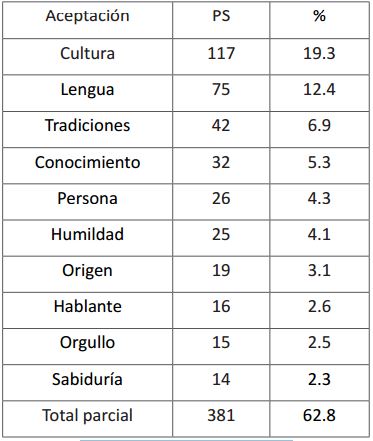 La aceptación es recibir de manera voluntaria lo que se ofrece, lo que otorga una persona a otra quien lo recibe libremente, sin objeciones ni miramientos; en el caso de las interacciones sociales, la aceptación es relacionarse de manera libre y voluntaria con los otros, sin importar sus características físicas o sociales, formas de pensar, ideologías, costumbres, preferencias sexuales o políticas. En el caso de los estudiantes de la muestra, la aceptación significa respeto hacia las formas de vida, tradiciones y cultura de los grupos indígenas. Es declarar de modo abierto su reconocimiento por el legado cultural y de conocimientos que estas comunidades aportaron en la conformación de la sociedad mexicana (ver tabla 3).