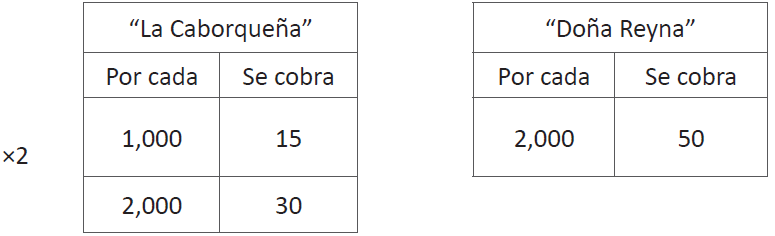 Una de las maneras más accesibles de comparar entre sí las razones de cobro de los establecimientos anteriores es igualando alguno de sus términos (Block, 2006); por ejemplo, se pueden duplicar los dos términos de la razón de cobro que ofrece La Caborqueña para igualar uno de sus términos con la razón de cobro que ofrece doña Reyna, como se muestra en la tabla 3.
