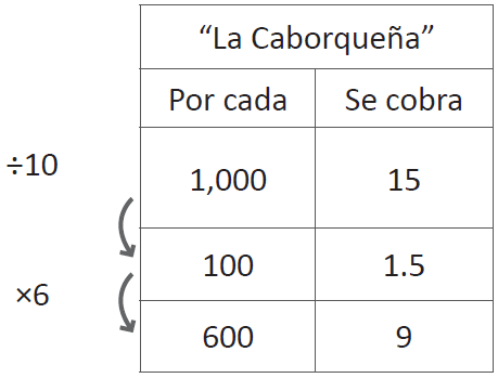 b) Uso de la equivalencia de dos reglas de cambio. Marco había elegido la razón 15 por cada 1,000, pero para calcular cuánto sería por $600, recurrió a la razón 1.5 de cada 100. Antes había explicado la equivalencia de ambas razones: “Estos (cobros) son iguales. Si quieres mil [señala el anuncio $1.5 por cada $100], va a ser igual que este [señala $15 por cada $1,000].” Hizo sus cálculos de manera silenciosa, no realizó anotaciones ni usó calculadora; tampoco se apoyó en los dedos, y obtuvo 1,581: