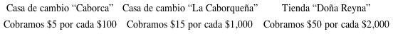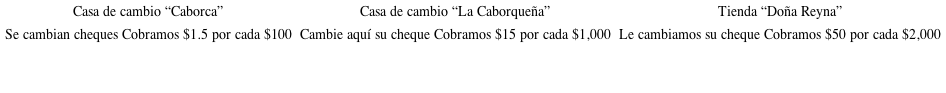 Como advertimos en la tabla 1, las casas de cambio “Caborca” y “La Caborqueña” cobran la misma comisión (1.5%), mientras que “Doña Reyna”, 2.5%. Las dos primeras razones son las que suelen anunciarse con mayor frecuencia en los negocios de Caborca, mientras que la tercera es lo que suele cobrar la señora Reynalda a los clientes que le pagan “deudas menores”. Se evitaron las expresiones % y “por ciento” a fin de usar las formas en las que originalmente cada negocio ofrece sus servicios.