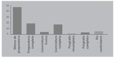 El nivel de estudios de los padres de familia que respondieron la encuesta se puede observar en la gráfica. Tenemos que 47% (332) tienen menos de preparatoria; 19.8 (140), preparatoria completa; 4.8 (34), licenciatura incompleta; 17.3 (122), licenciatura completa; 1.6 (11), un posgrado incompleto; y 4.2 (30), posgrado completo; 5.4% (38) no contestaron.