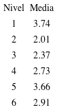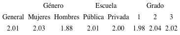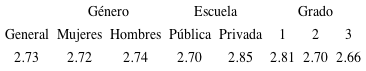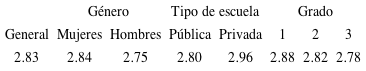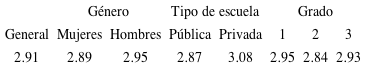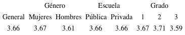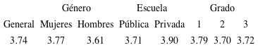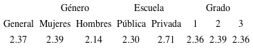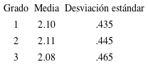 Las mujeres tuvieron una media de 2.39 con desviación estándar de .753, y los hombres, de 2.14 con desviación estándar de .758. Los padres y las madres de familia de primer grado tuvieron una media de 2.36 con desviación estándar de .784; los de segundo, una media de 2.39 con desviación estándar de .729; y los de tercero, una media de 2.36 con desviación estándar de .766.