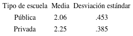 Las escuelas públicas tuvieron una media de 3.71 con desviación estándar de .490, mientras que las privadas, una media de 3.90 con desviación estándar de .217. La prueba T reflejó diferencias significativas en las medias de escuelas públicas y escuelas privadas. Esto significa que los padres y las madres de familia cuyos hijos asisten a escuelas privadas realizan actividades de involucramiento que implican establecer en la casa ambientes adecuados para favorecer el éxito escolar con mayor frecuencia que los padres y las madres cuyos hijos asisten a escuelas públicas.