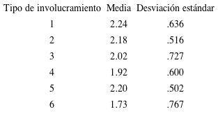 Las medias de los tipos de involucramiento se muestran en la tabla 11. Por arriba de la media de la escala (2.5) se encuentran los involucramientos 1, 4, 5 y 6, con la media más alta el tipo 1, que indica que la actividad de involucramiento que más se lleva a cabo es generar un contexto familiar favorable para un buen rendimiento académico. El tipo de involucramiento con la menor media fue el 2, y son las actividades que implican una comunicación adecuada entre la escuela y la familia las que menos realizan los padres y las madres de familia.